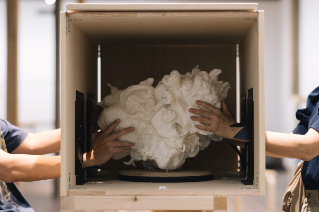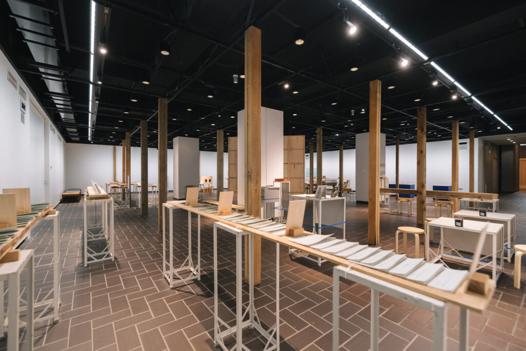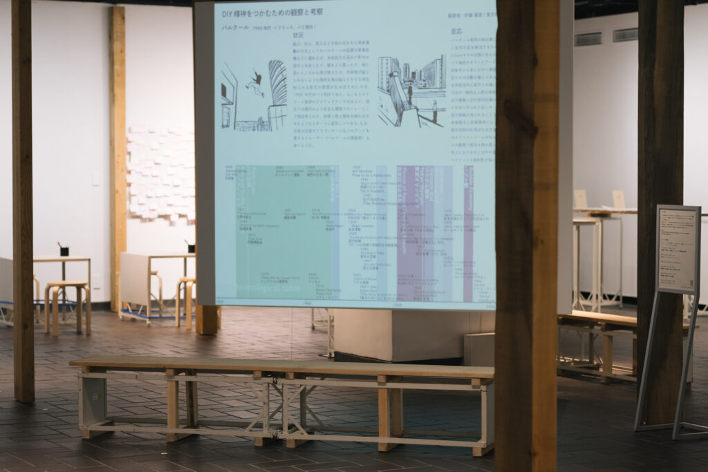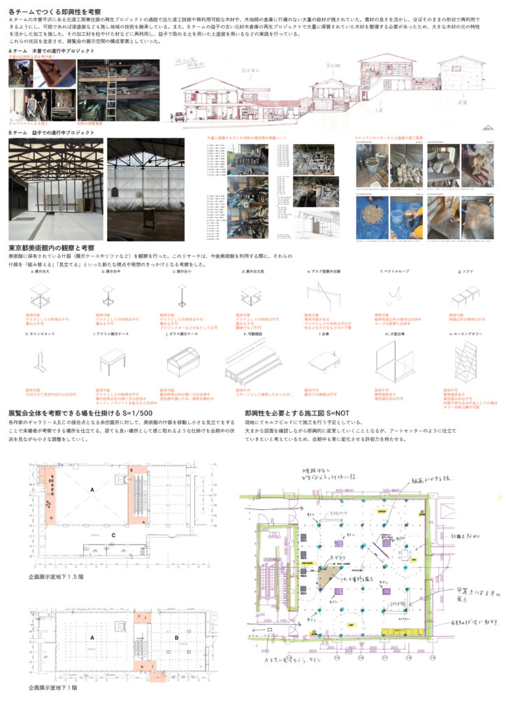 各チームで進行中のプロジェクトの材や美術館の備品のみで空間を構成し、鑑賞する以外のアクティビティを美術館のなかへもたらした。